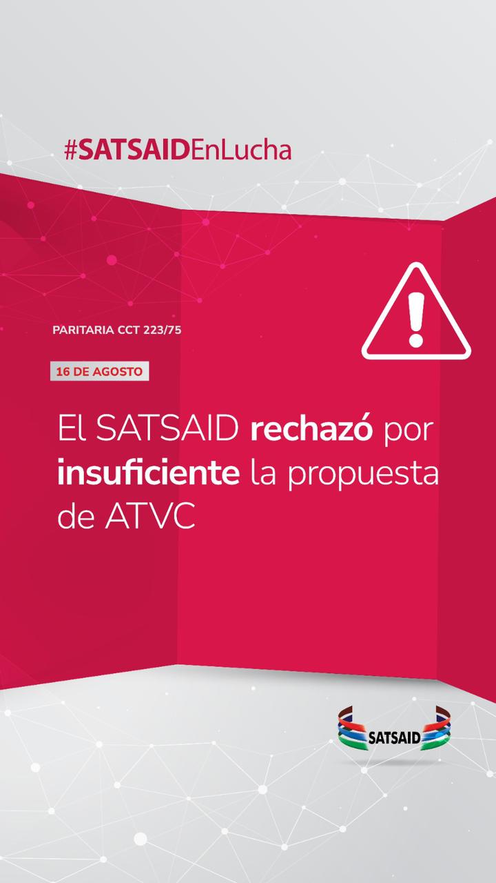 El SATSAID rechazó por insuficiente la propuesta salarial realizada hoy por los representantes de la Asociación TIC, Video y Conectividad (ATVC). Fue el primer encuentro realizado entre las partes luego de que el sindicato haya realizado una contundente jornada nacional de protesta en todo el país y haya ampliado su solicitud salarial para contemplar los meses de julio, agosto y septiembre.